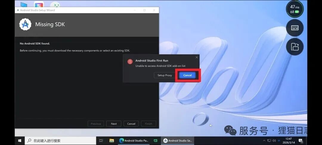 11.选择电脑本地的汉化包之后,来到了这个界面,直接关掉Android studio