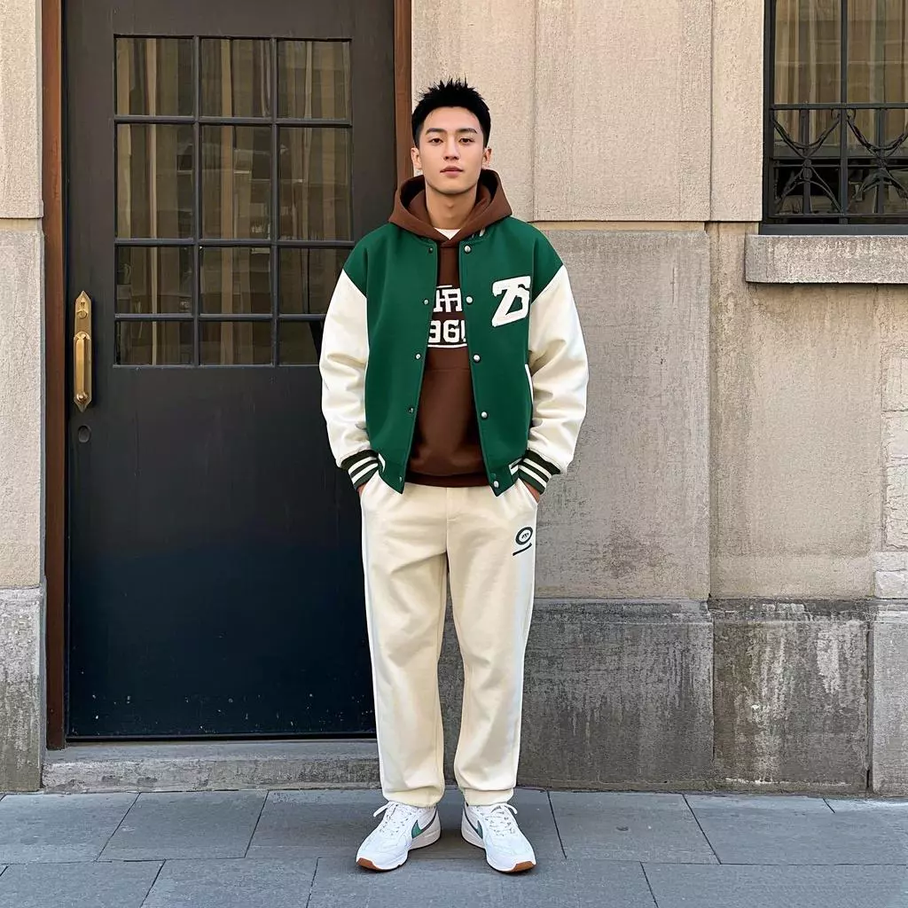 搭配要点:绿色棒球服清新且充满活力,彰显青春朝气。棕色连帽卫衣为穿搭增添温暖质感,丰富了视觉层次。白色卫裤搭配白色板鞋,纯净的白色系,营造出干净、清爽的氛围。