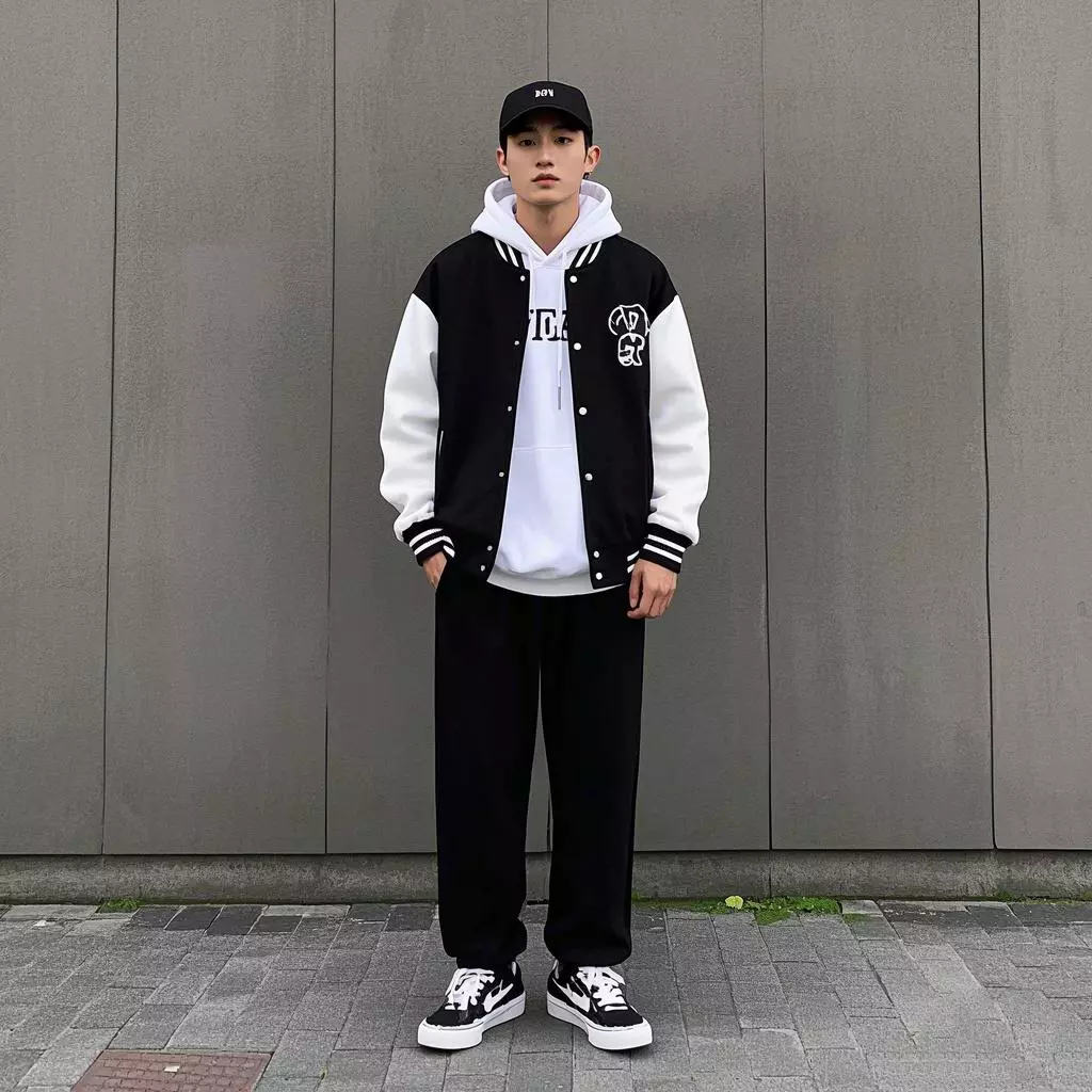 搭配要点:黑色棒球服神秘而硬朗,内搭的白色连帽卫衣,提亮整体造型。下身搭配黑色卫裤,营造出利落干练的视觉效果,黑色板鞋则进一步强化了整体风格,简洁而低调,与整体穿搭相得益彰。