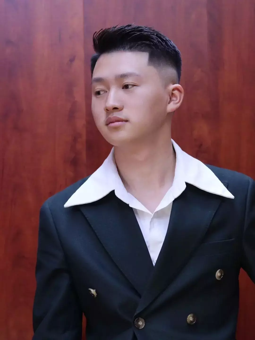 两侧头发推剪出渐变效果,鬓角也精心修剪一番,呈现出干净利落的轮廓感;头顶保留3~4厘米的长度,这样既显得蓬松,又不容易乱翘;