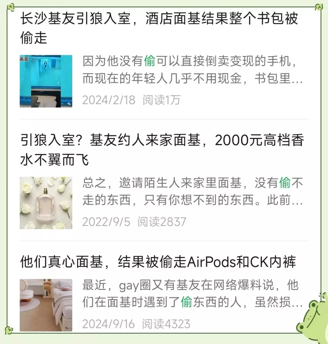 对于圈内的一些基友来说,在面基的过程中遇到小偷似乎不是新鲜事了。尽管下大垅在过去几年里报道过许多类似的事情,且一直呼吁大家注意面基的人身财产安全,但还是有基友遇到小偷,被偷走东西。