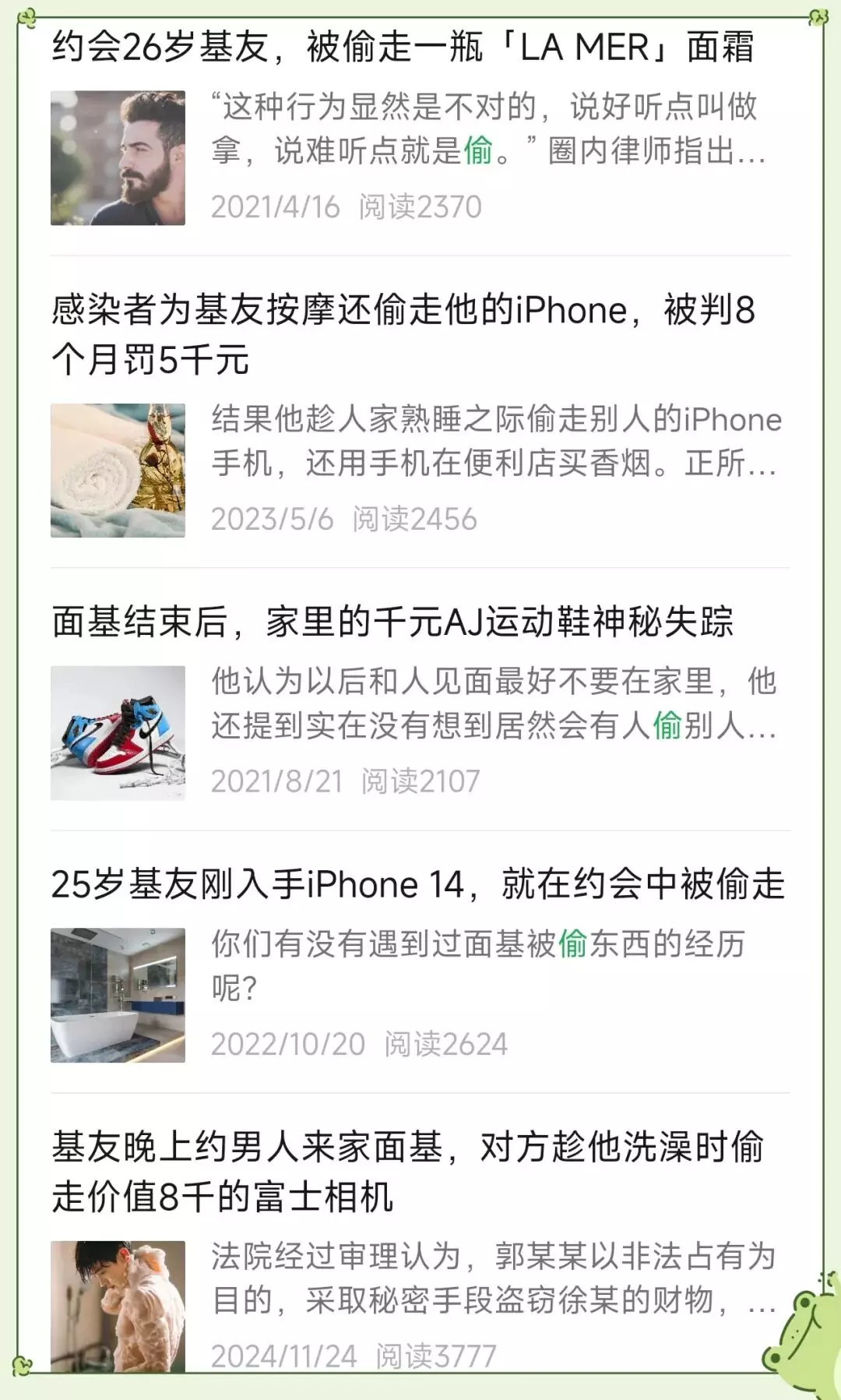 3月15日,下大垅梳理了过去几年中发表的数十篇有关面基被偷东西的文章,这些物品种类繁多,从白袜到水壶再到烤肠机,从安德玛拖鞋到iphone 17再到2000元高档香水,只有你想不到的东西,没有小偷不会偷的东西。
