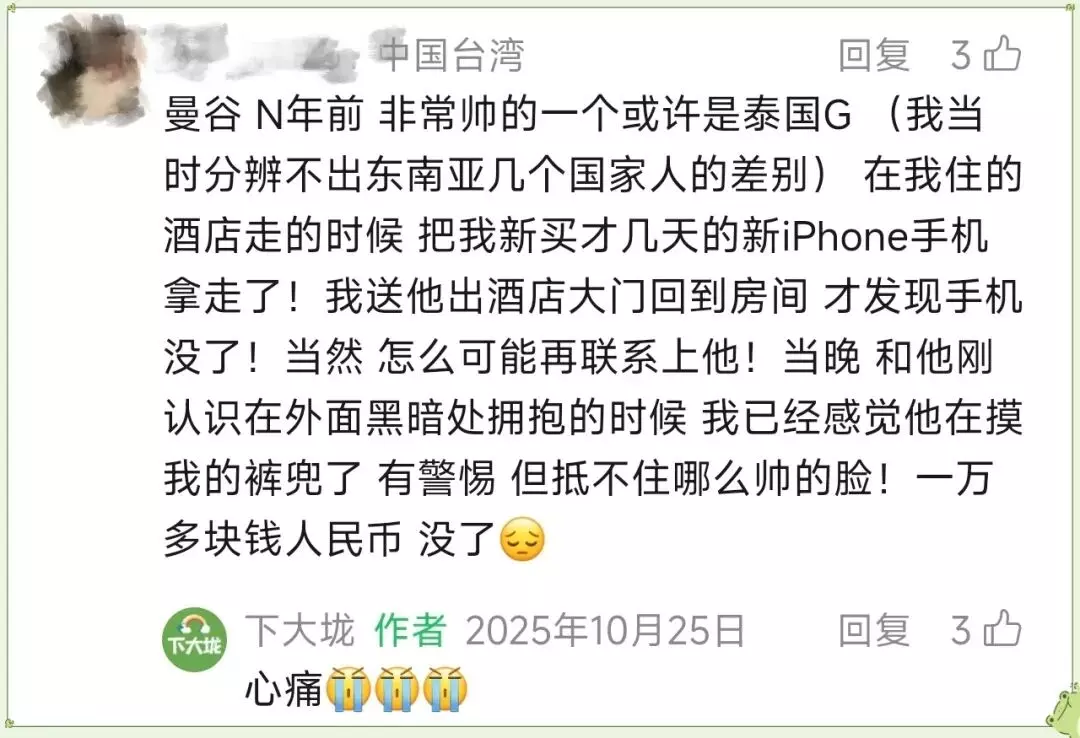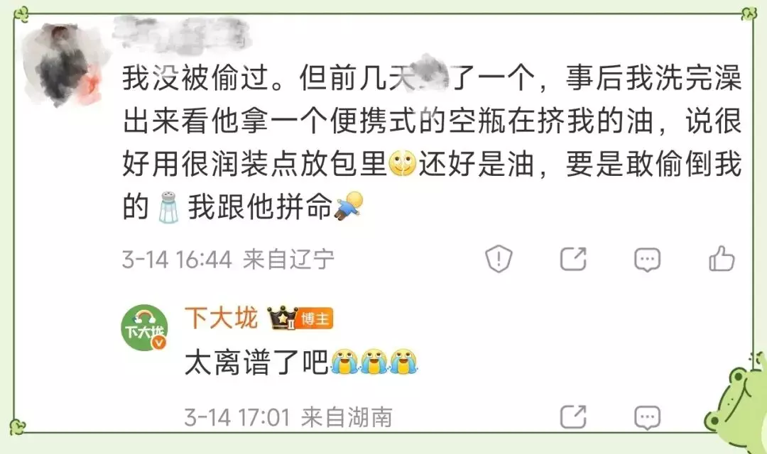 与此同时,也有一些基友在下大垅的微博和公众号留言区分享了他们的被偷经历。以下是他们的真实分享,下大垅对此做了摘录。