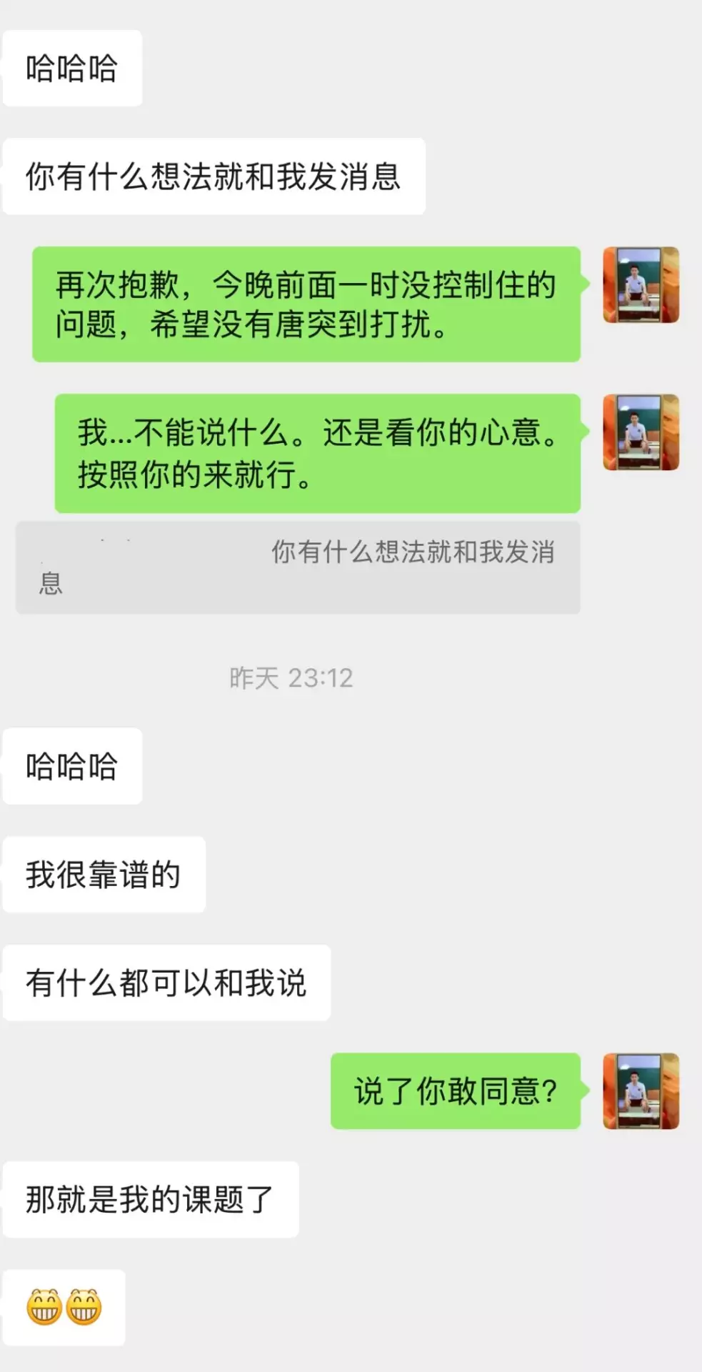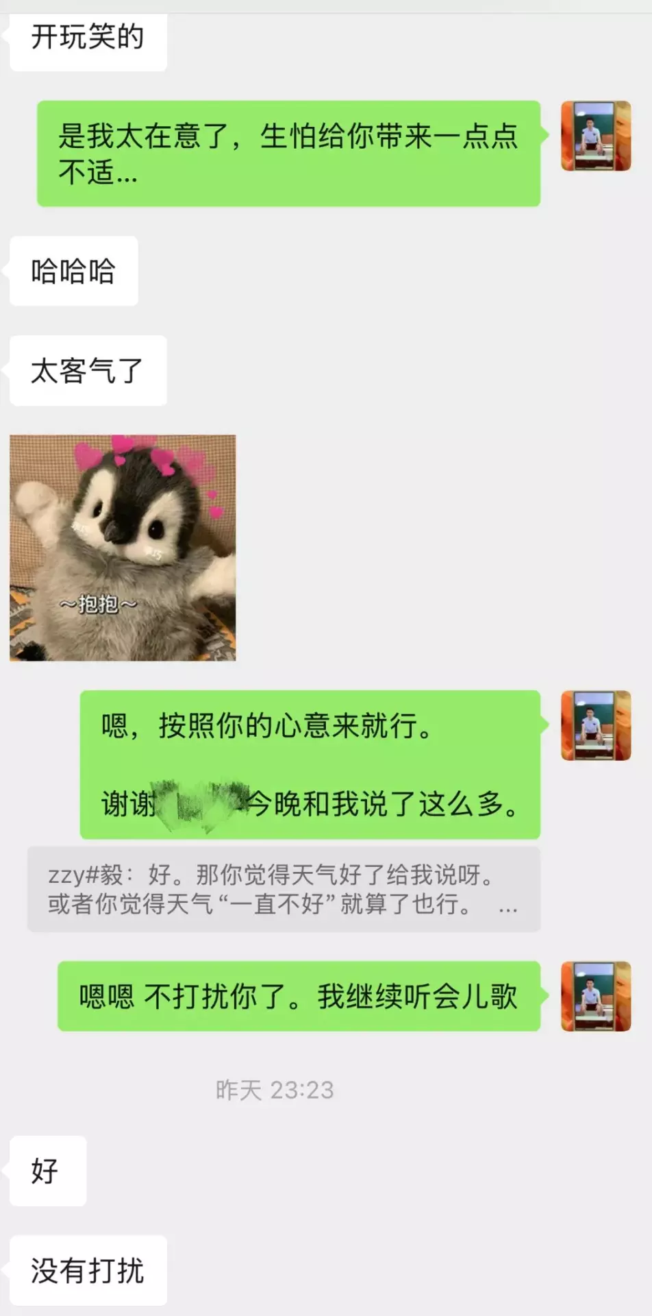 我当时感觉整个人在音乐的作用下好像也是晕晕的,看到他发的“有什么都可以和我说”这句话,一下子上头来劲了。
