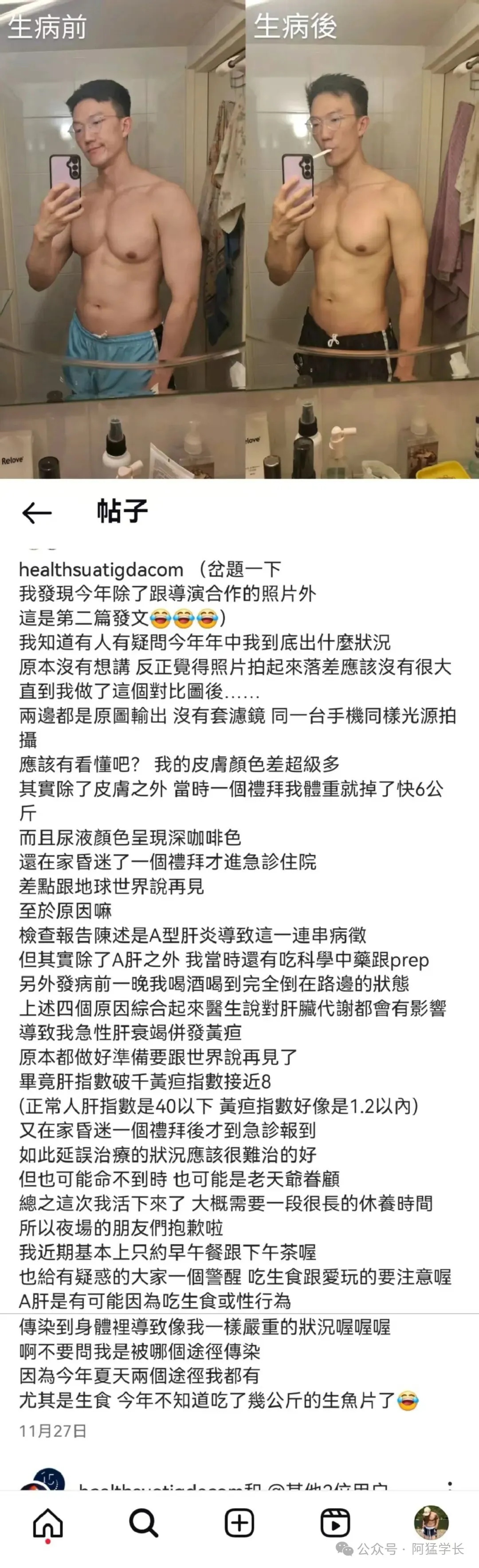 直到2025年11月27日,他才鼓起勇气向粉丝们坦白,过去一段时间在OF或FO上发布的一些动态和影片,全部都是之前的。然后他消失的那一段时间,是因为自己得了A肝,在进行治疗,并且感谢一段时间来,大家对他的关心和问候。
