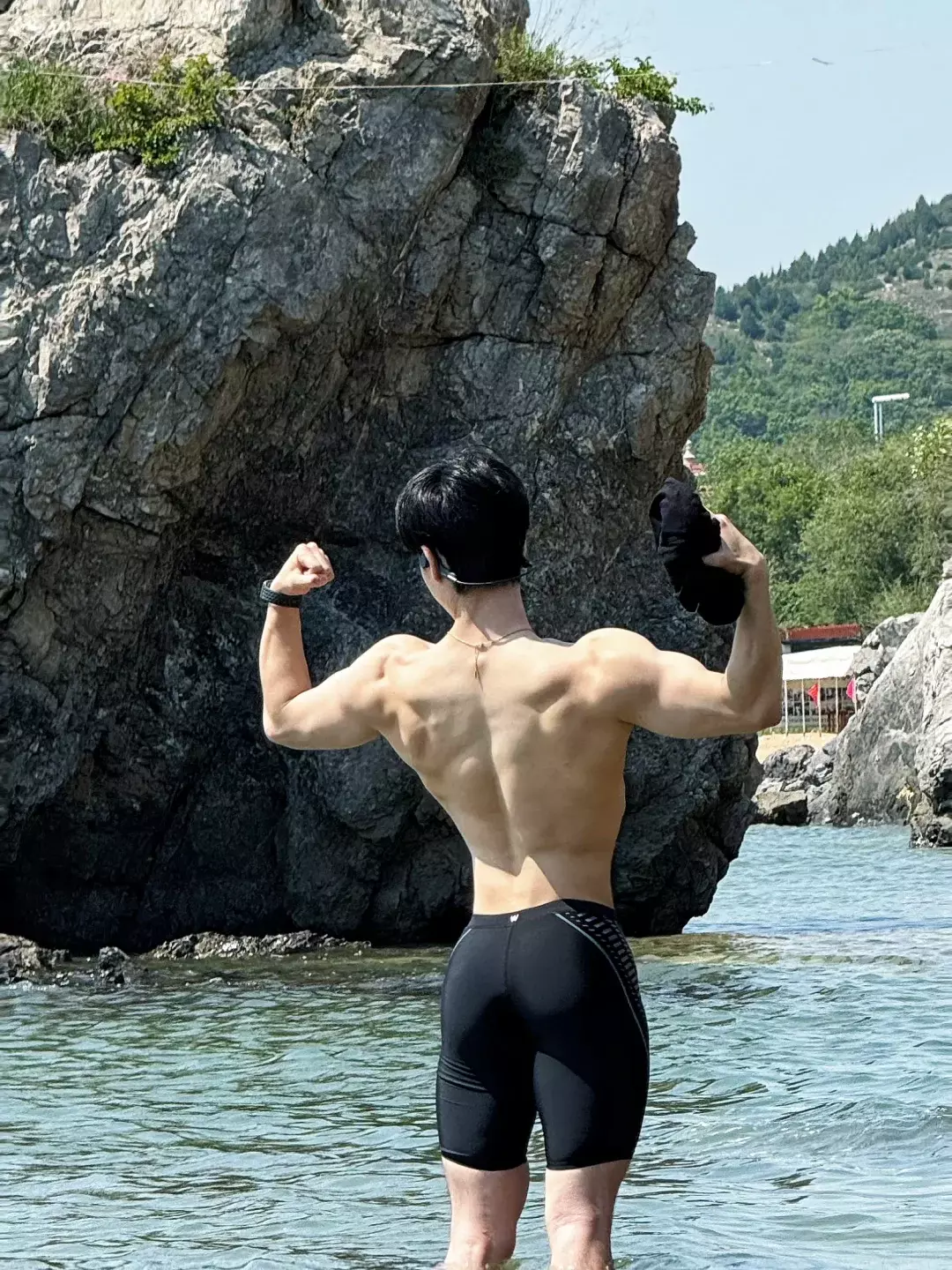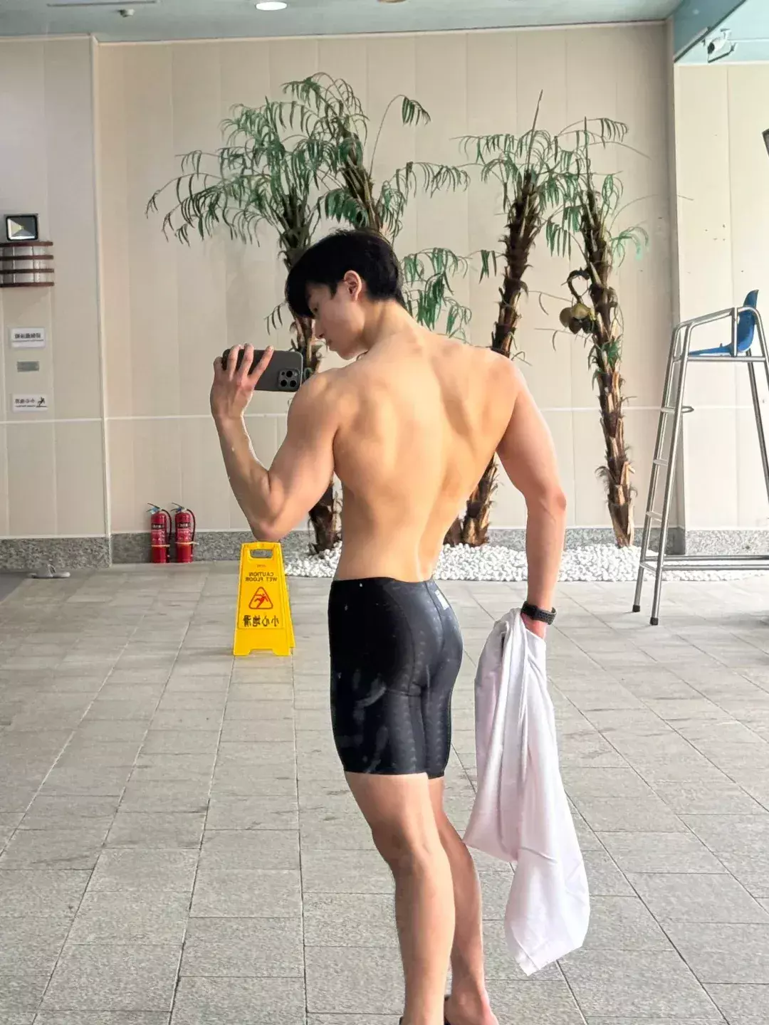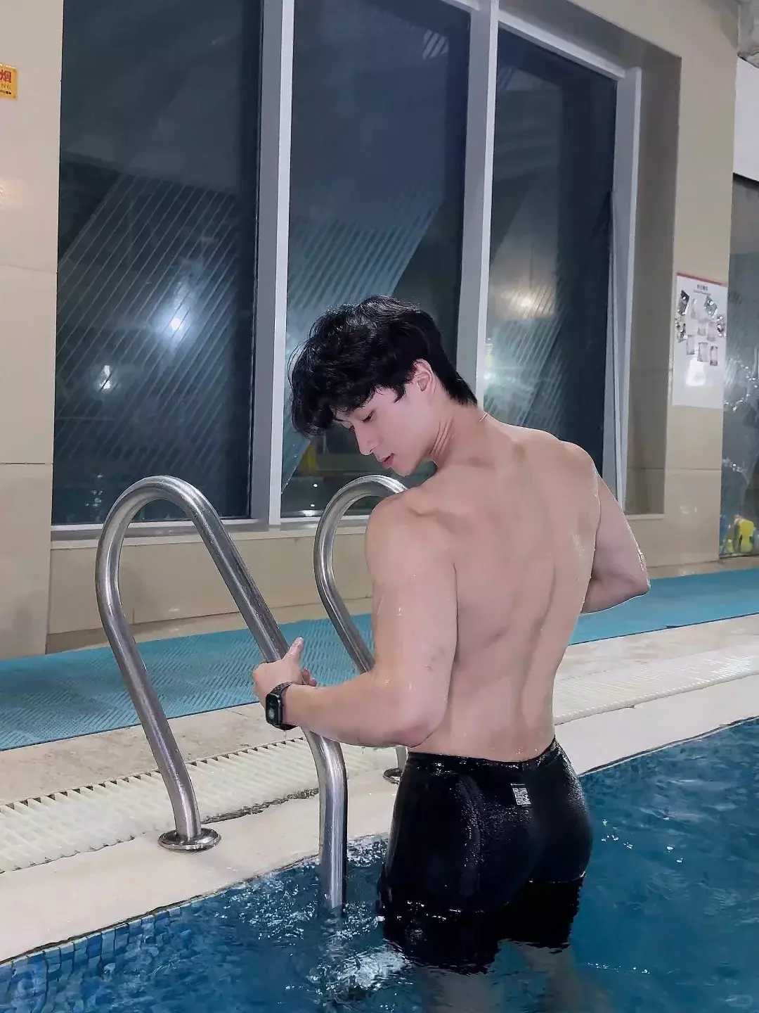 他的职业是游泳和健身私教。游泳对肩部活动度和背部线条帮助很大,长期下水的人,身体的延展感会更明显。再叠加力量训练,线条就会更立体。