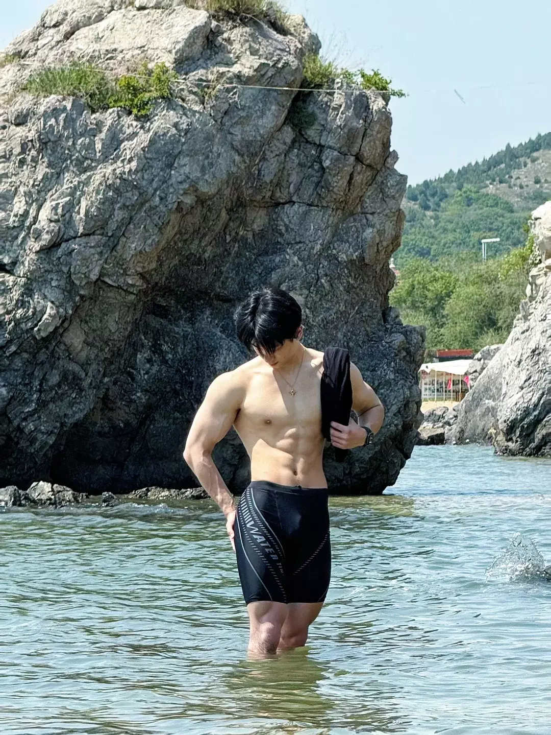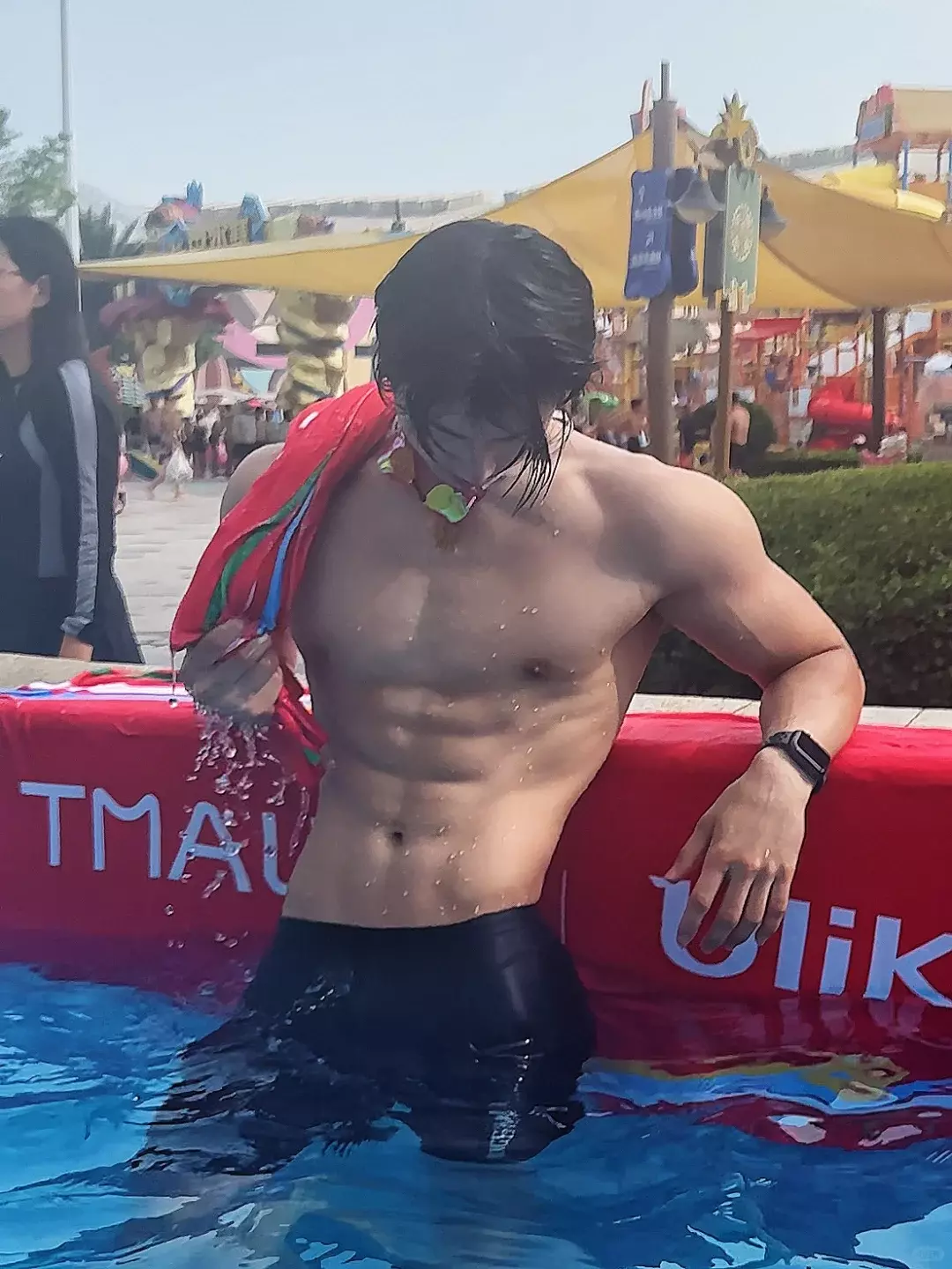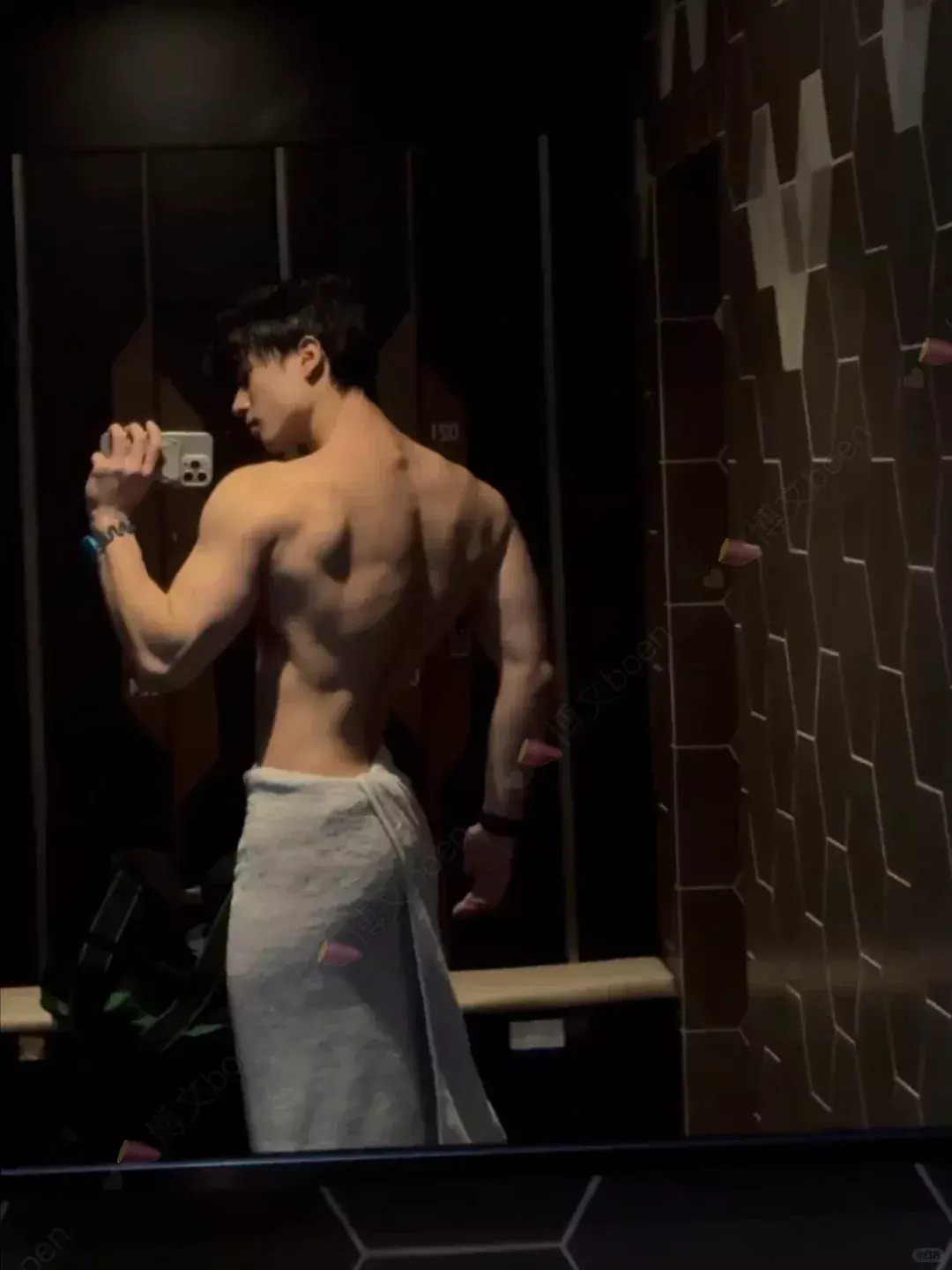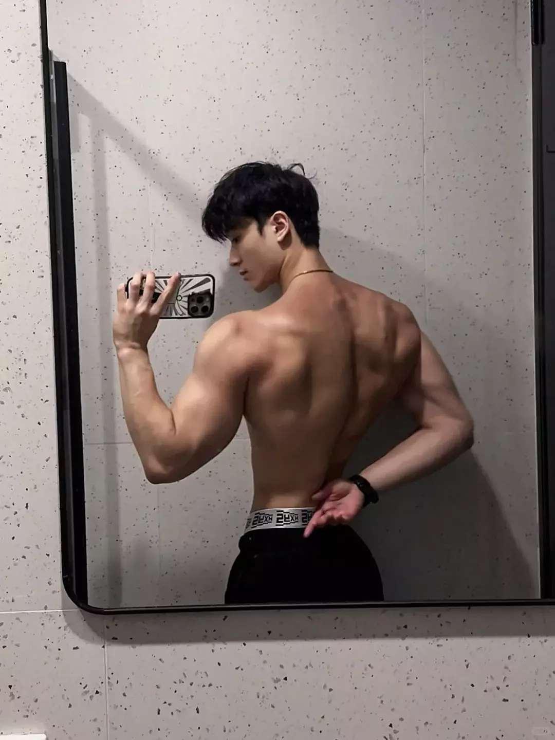 他的职业是游泳和健身私教。游泳对肩部活动度和背部线条帮助很大,长期下水的人,身体的延展感会更明显。再叠加力量训练,线条就会更立体。