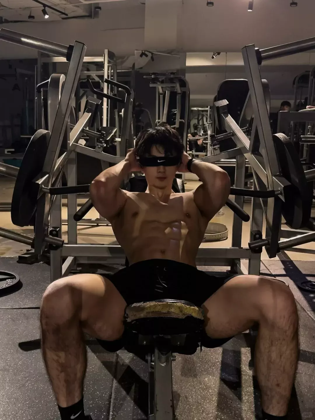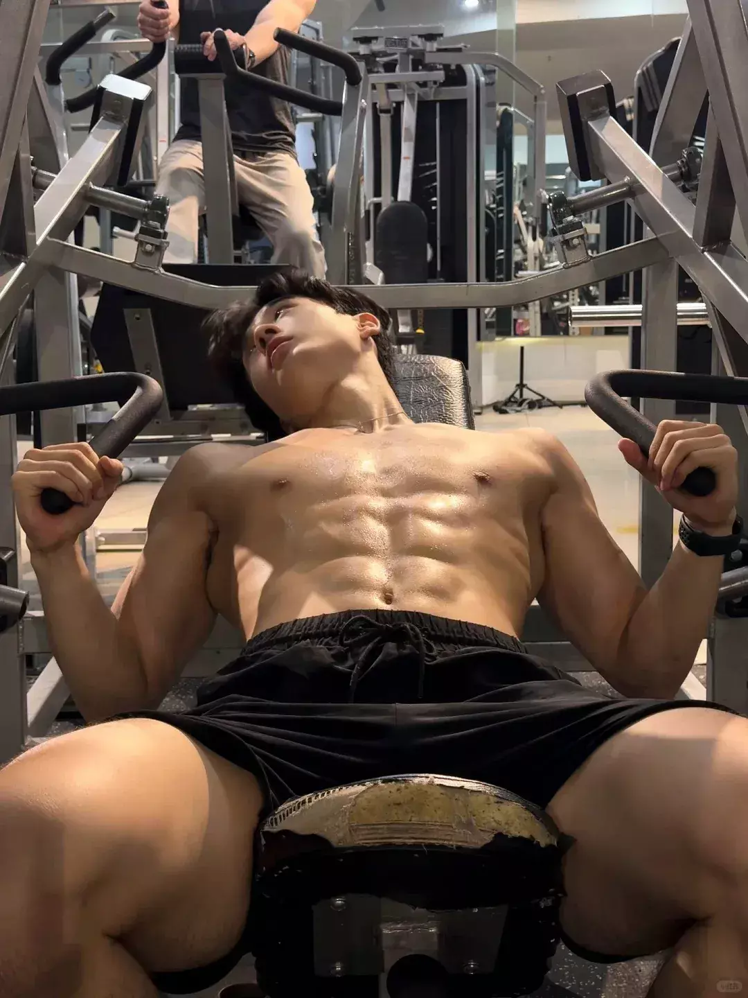 肩部线条舒展,腰部轮廓紧致,整体呈现出倒三角的体态,整体体脂控制在一个中低水平,腹部能看到清晰分界。这样的状态放在健身房里,属于一眼能看出是长期训练的人。