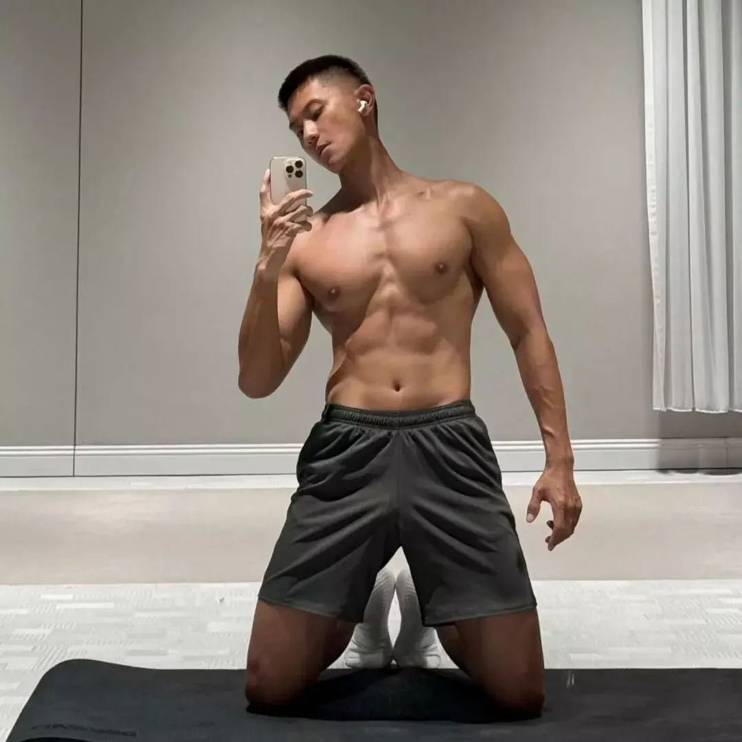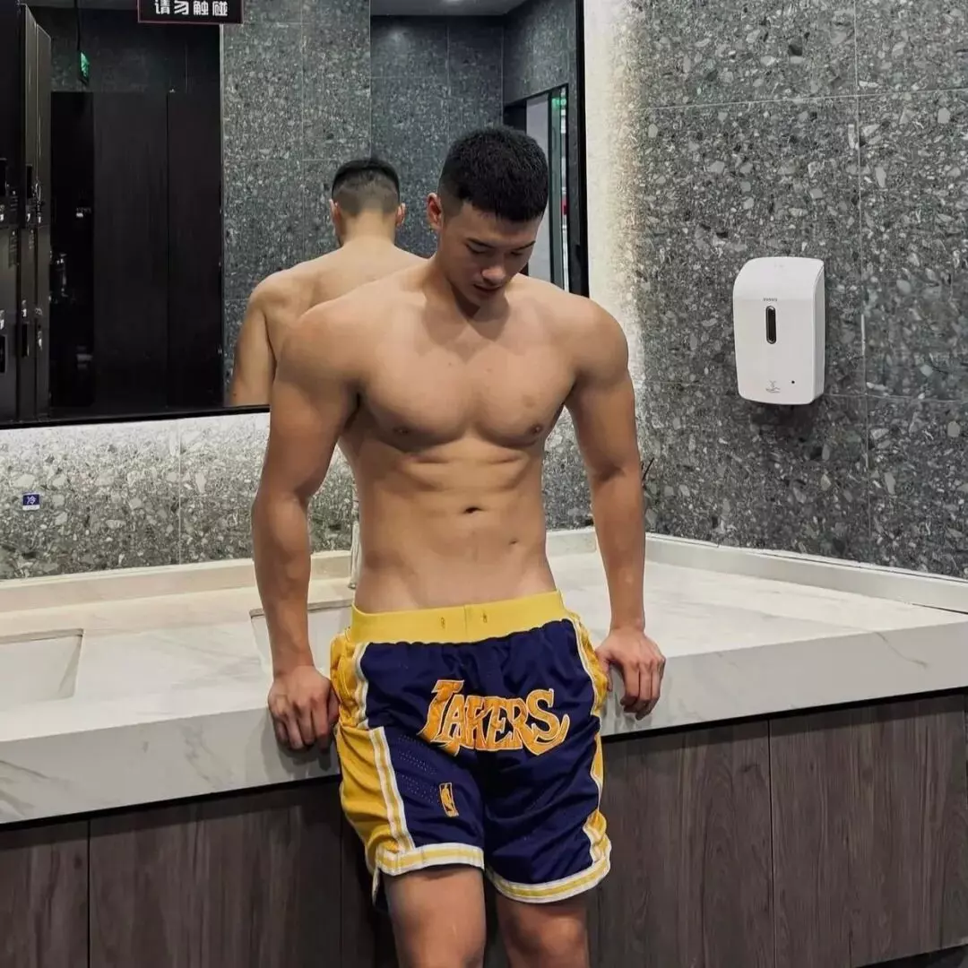 赤膊,球裤,寸头,眼神漫不经心地往下看——这是在做营业吗?肩部很宽,腹肌的线条虽不是格外清晰,但人鱼线也若隐若现了。恰似最随意的一拍,却比任何摆拍都更让人挪不开眼。