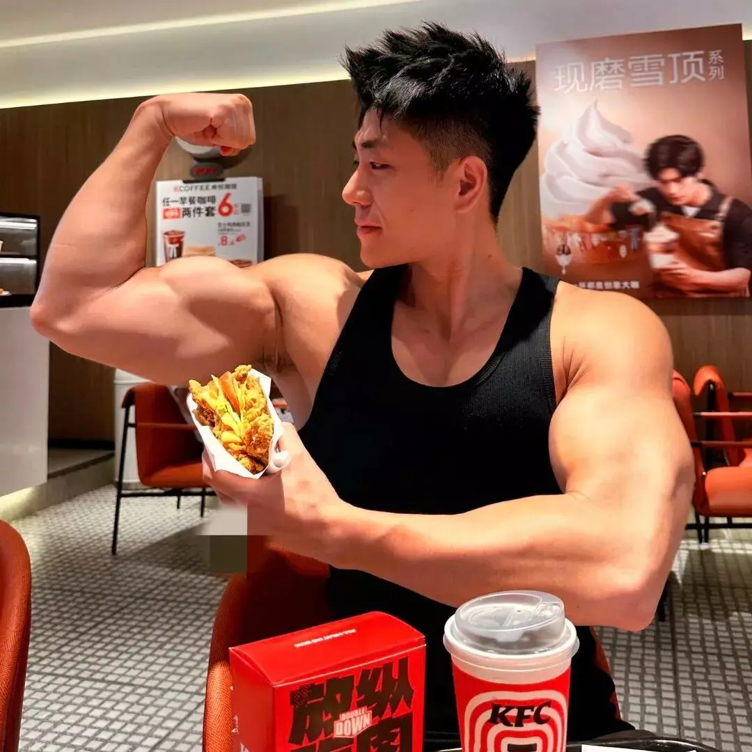 黑背心把肩背线条撑得饱满,炸鸡与麒麟臂的对比,调皮大男孩劲儿呼之欲出——我盯着屏幕疯狂心动,这谁能扛得住啊!纯纯的 “放纵也有资本” 的肌肉猛男,深得我心。