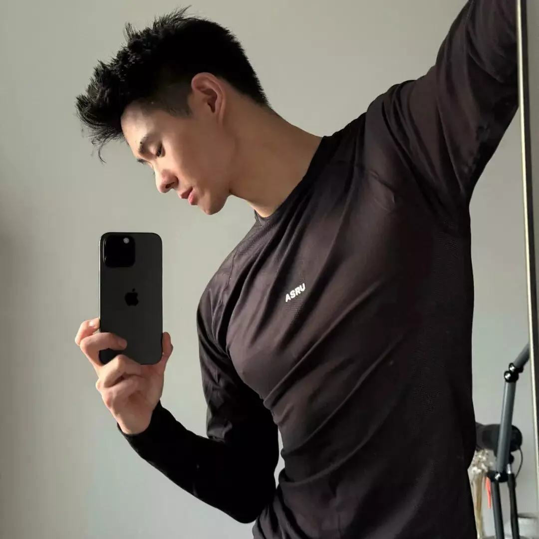 速干衣微微湿透,把肩背和胸肌的轮廓老老实实交代出来,没有修饰,反而更直接。侧脸对镜,眼神淡漠——这种"我只是随手拍了一张"的状态,却比任何精心摆拍都更难移开眼睛。斯文和肌肉共存这件事,真的有人专门来制伏我的。