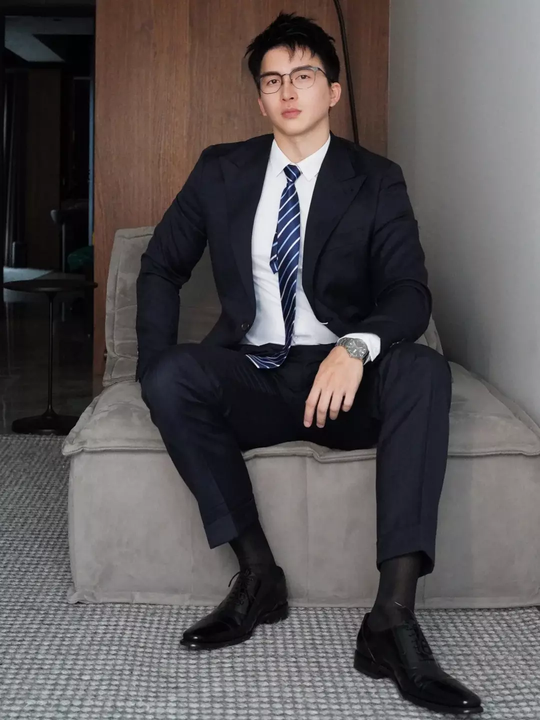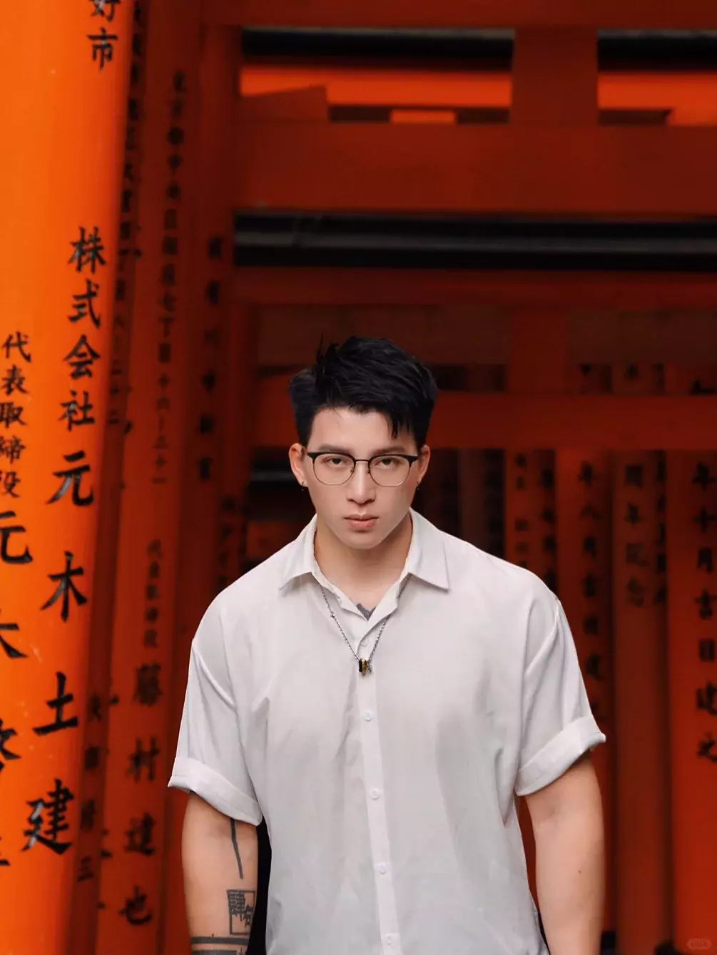 戴眼镜的时候,整个人干干净净,像刚下班的医生,白衬衫一扣,气质是收着的。那种不太爱说话、做事很稳的感觉,很容易让人自动带入点职业滤镜。