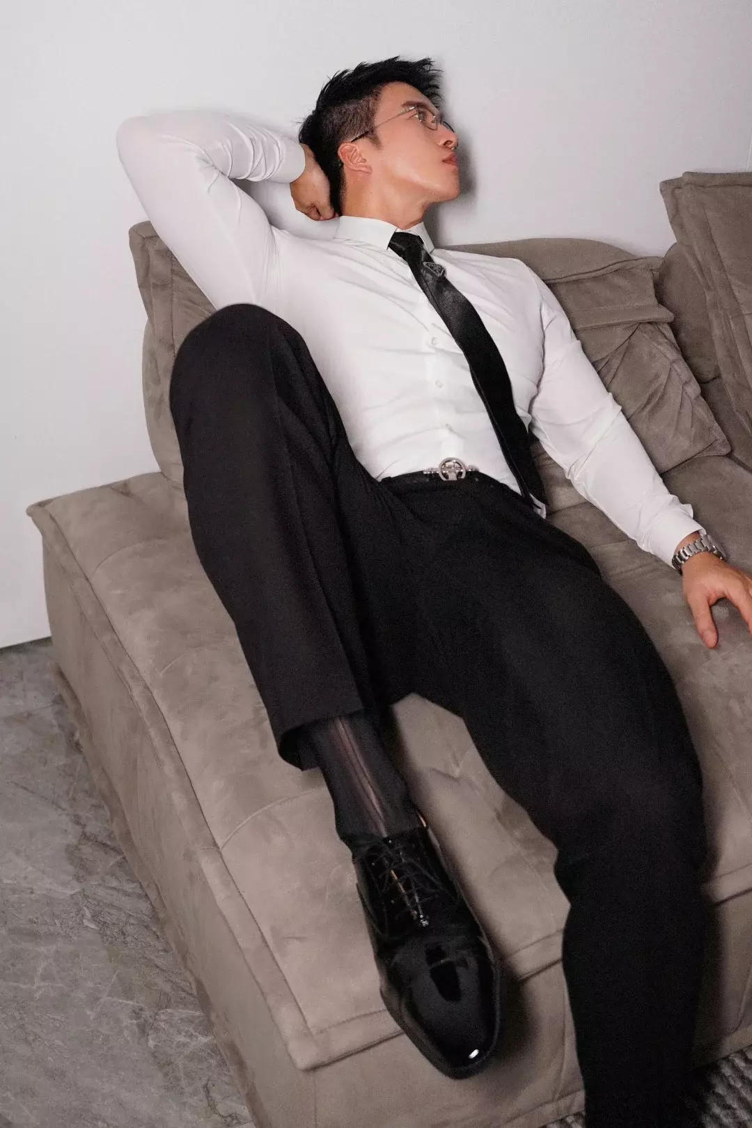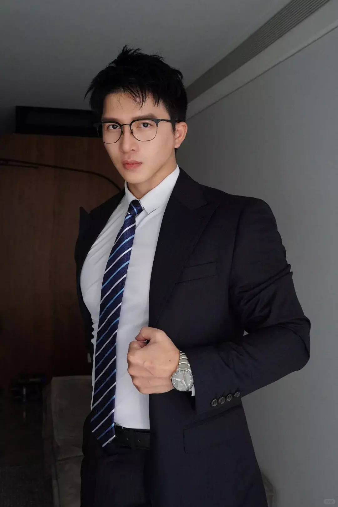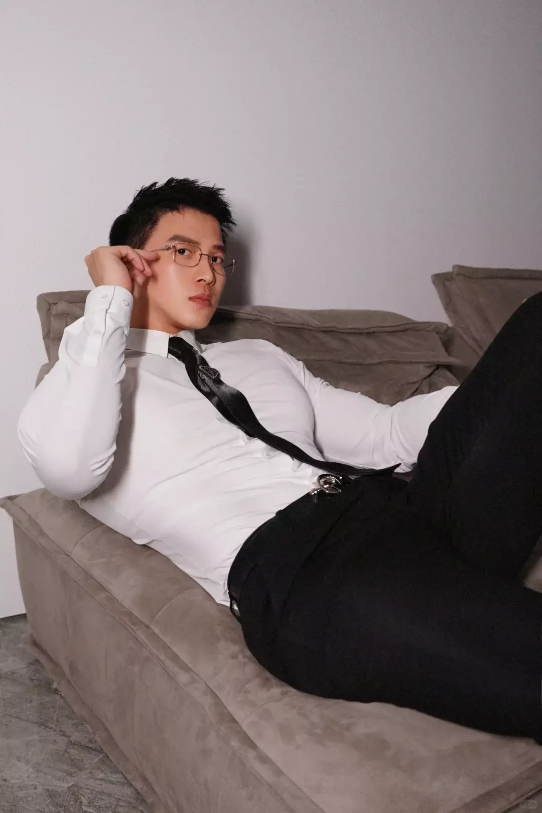 他拍过不少衬衫照。扣子系到一半,布料贴在胸口,隐约能看到里面的起伏。你说他是禁欲那一挂,好像也成立;可稍微松一点,又有点别的味道出来。