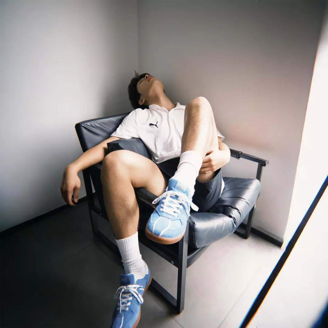 这位小哥哥是偷了阳光来当滤镜的吧!一条腿随意抬高搭在椅子上,手自然垂落……小腿线条流畅,蓝鞋和白袜的搭配又运动又休闲,整个人散发出一种运动后放松的满足感,光影打在脸上是那么纯净的感觉。我长已经脑补出一万字的校园恋爱小说啦!这松弛感也太绝了吧,感觉连空气都在为他心动~