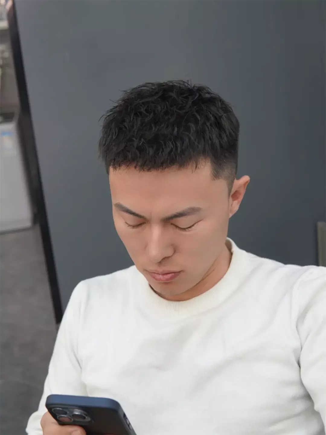 虽然说男生的发型不能乱剪,但是也要尝试不同的选择,比如上面这款纹理烫短发,在短刘海发型的基础上,改变一下原来头发的状态,做一个纹理烫效果,整体纹理感极强,看上去特别时髦有范儿,也非常帅气潮流;