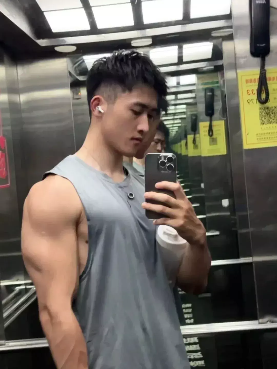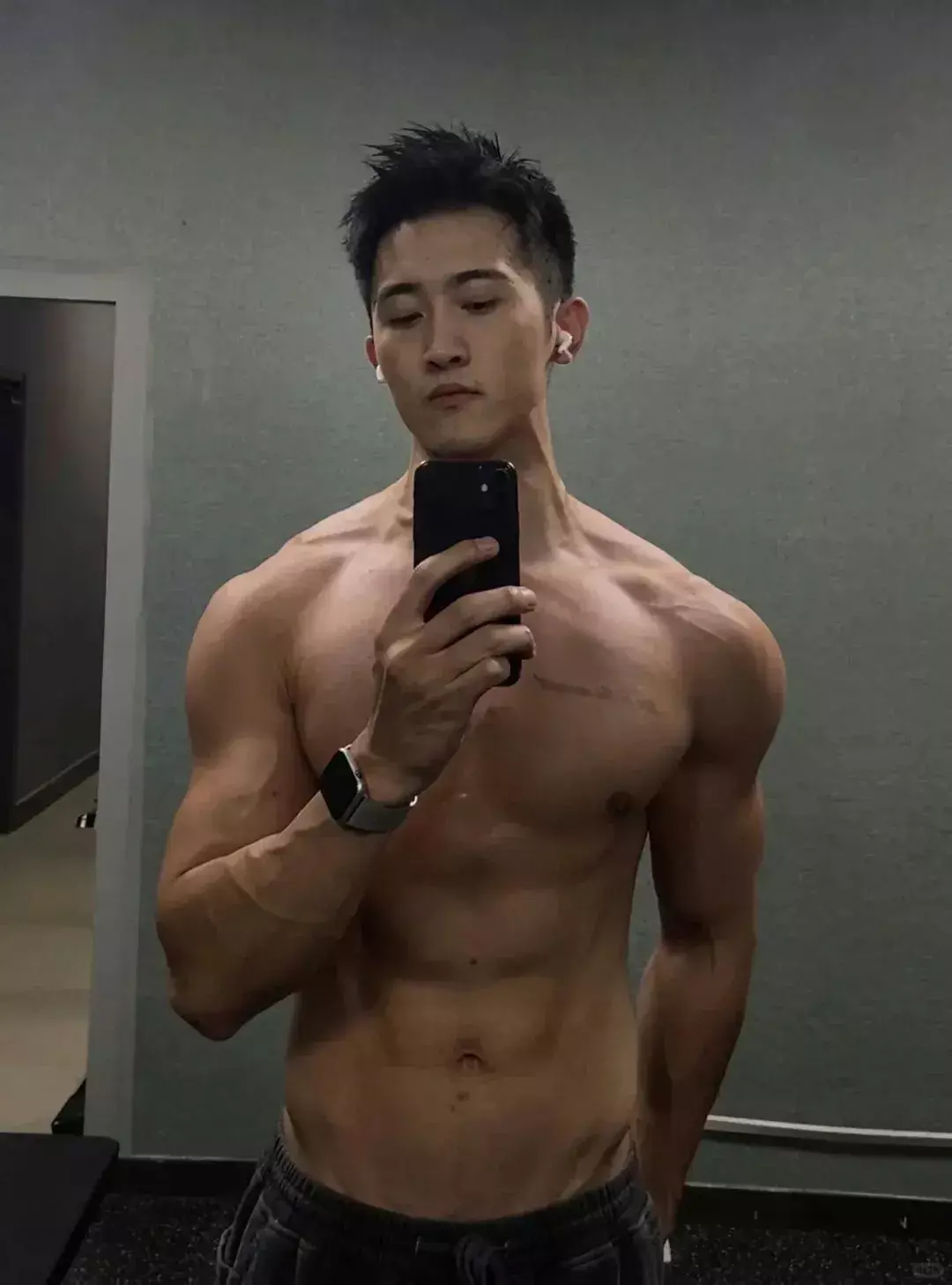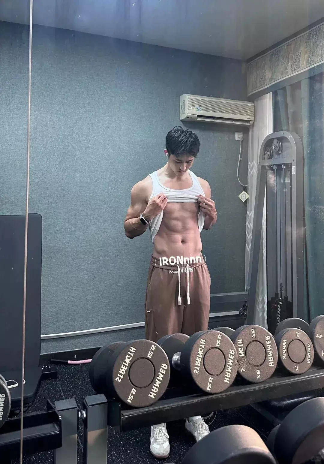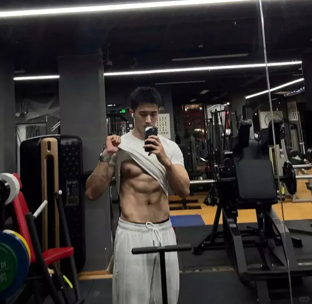 穿着紧身健身背心时,他会偶尔撩起衣角,充血的腹部肌肉线条清晰又有力量,看得人忍不住直呼 “太吸睛”。