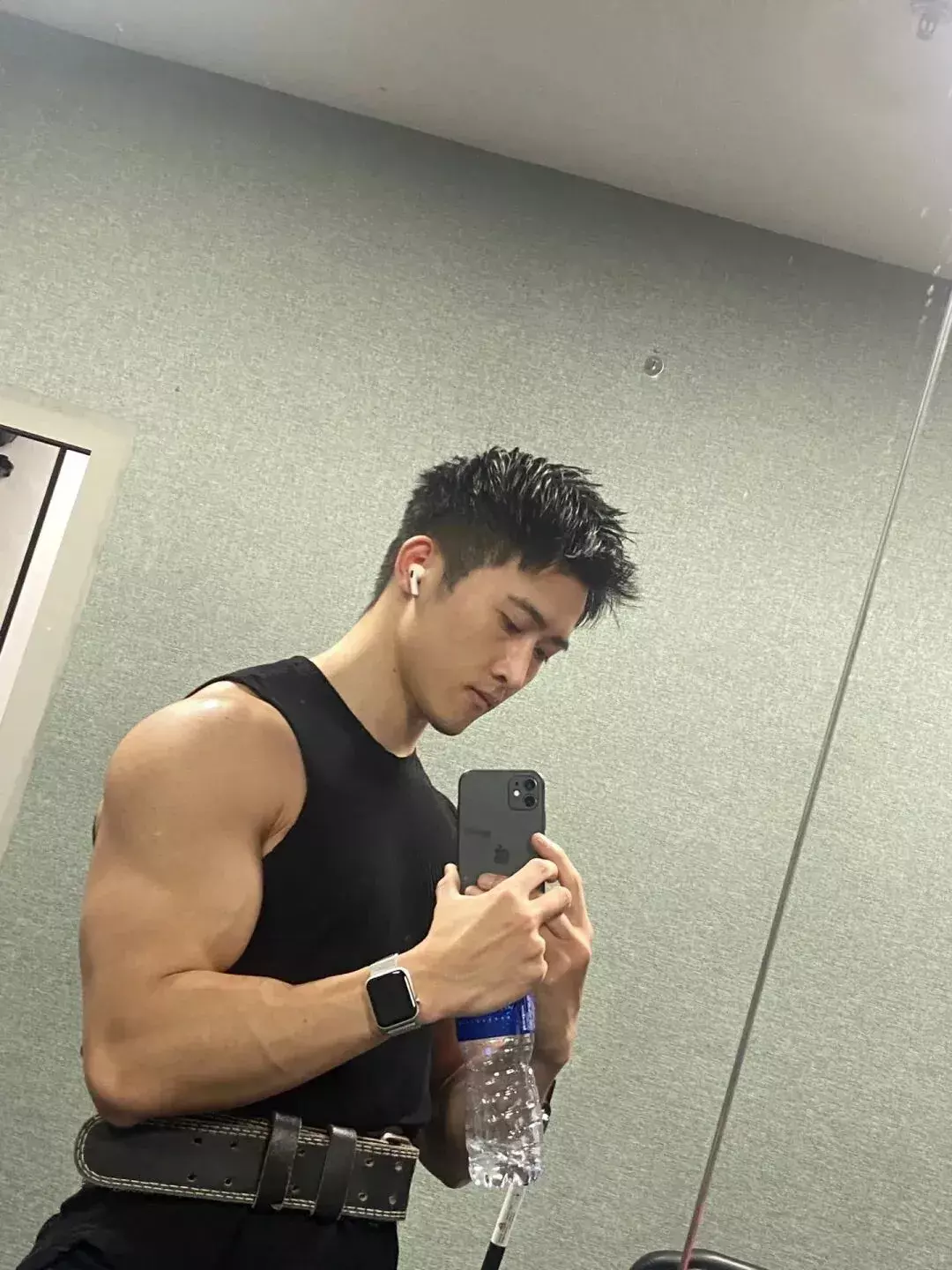 换上宽松背心,粗壮的手臂肌肉根本藏不住,肩背线条宽阔又挺拔,宽肩窄腰的比例简直是老天爷赏饭吃。
