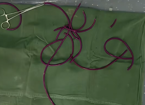 医生团队紧急实施腹腔镜微创手术,通过腹部的微小穿刺切口,在腔镜的直视下,小心翼翼地将打结的跳绳剪断,再分段取出。