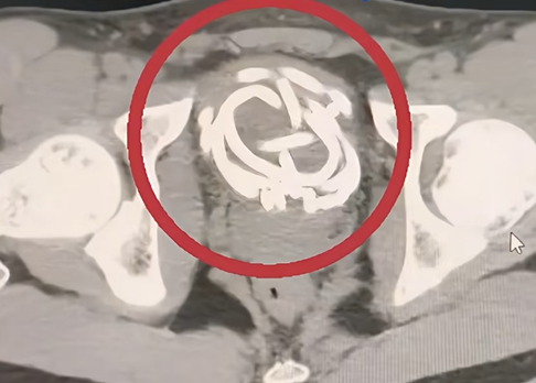 接诊的李一帆博士团队紧急检查后发现,一段30厘米长的橡胶跳绳已进入男孩膀胱并打成死结,滞留近8小时引发急性尿道感染,黏膜布满脓胎,再拖延可能导致膀胱穿孔、影响生殖和肾功能。